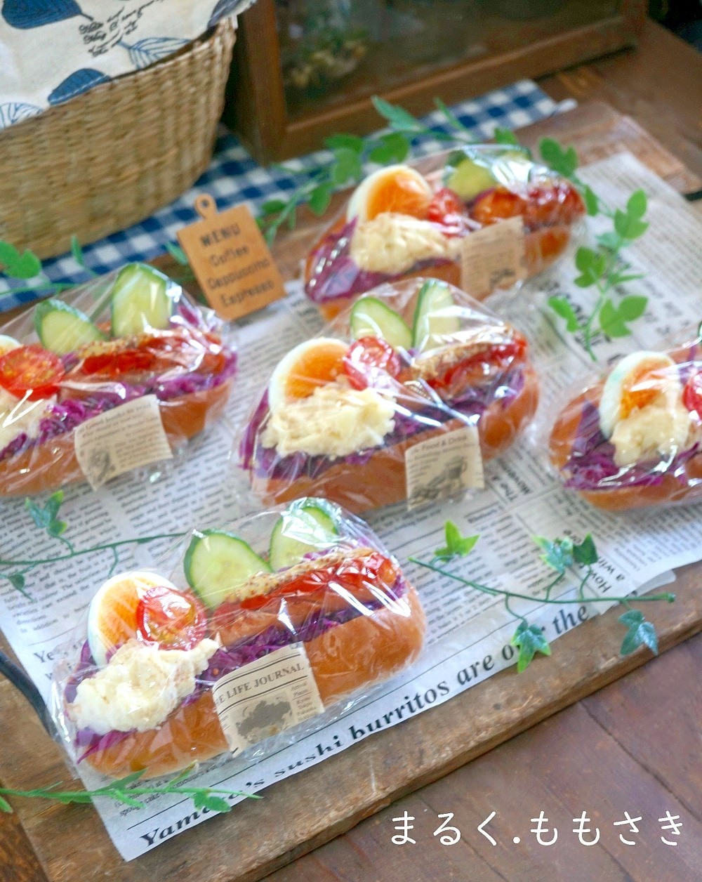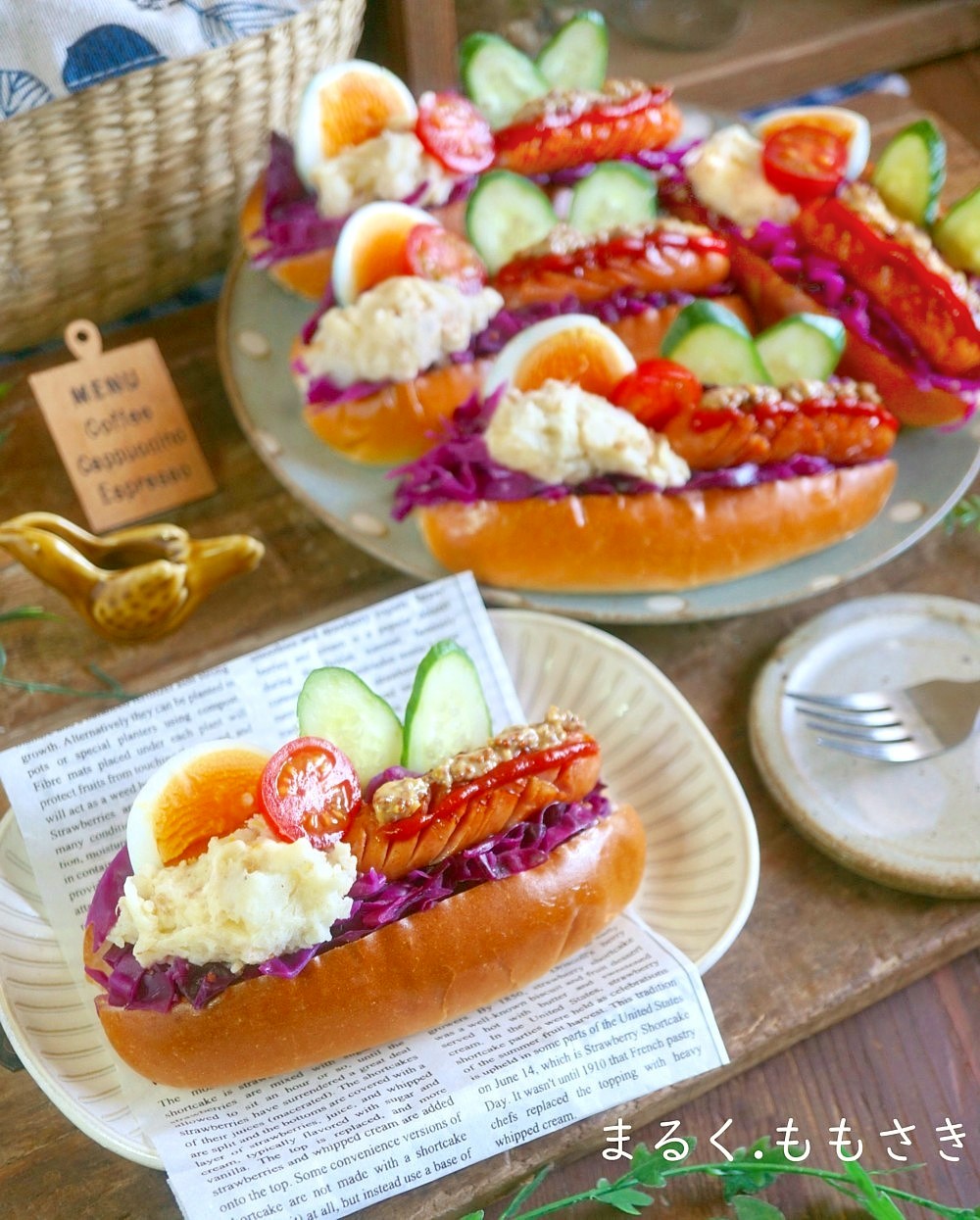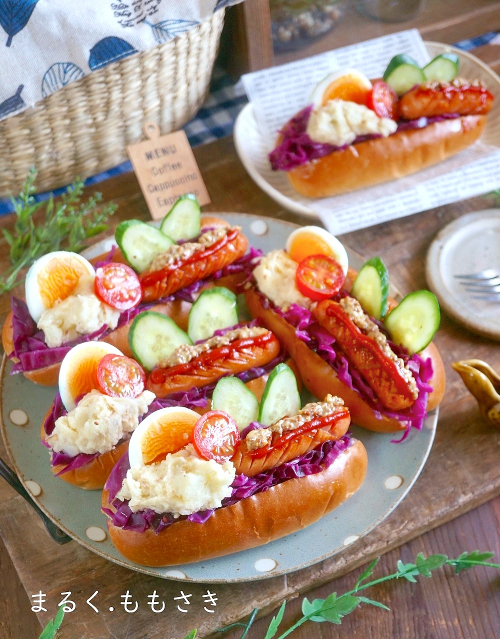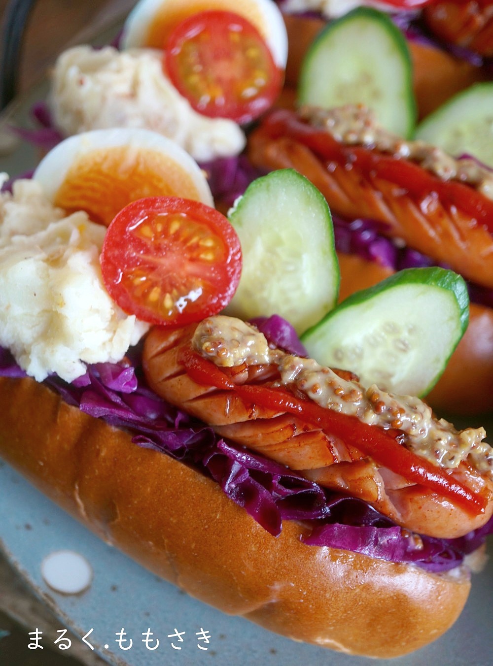私は辛子バターを塗り紫キャベツのザワークラウトを詰めマヨネーズを絞りソーセージを乗せ、ケチャップ・粒マスタードを搾りプチトマト、キュウリを挟みゆで卵を挟みました。