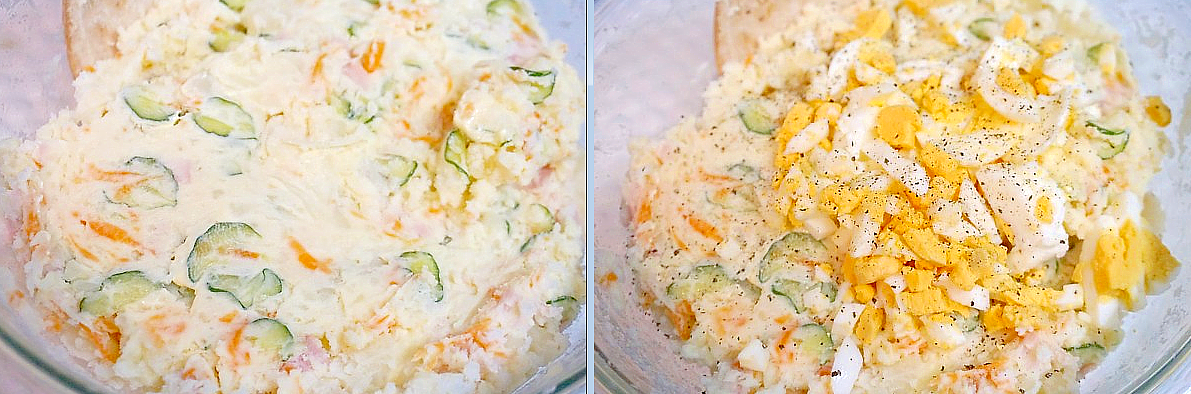 茹で卵を初めから混ぜてしまうと黄身が全体に混ざってしまうので、私は仕上げに入れさっとひと混ぜするのが好きです