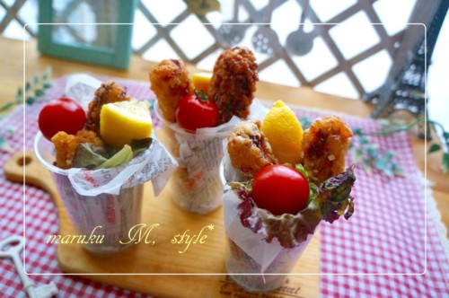 ホワイトヨーグルトフライドチキン 鶏手羽先のフライドチキンです! ヨーグルトに漬ける事でシットリジューシーなフライドチキンになりました♪ それをカップに入れてみました^^ 食べやすく、子供に出すときや、それこそ花火や何かを観覧しながら 摘むにもいいか ...