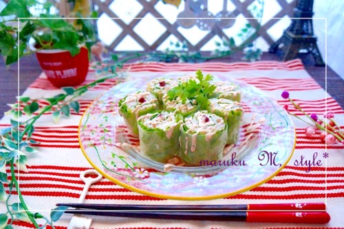 生春巻きすし 生春巻きって何を巻いても美味しくなってしまう(^w^) 今回は、生春巻きで巻いた、巻きすしを作ってみました。 しそ梅とゴマを入れた寿司飯の中心にそれぞれ、 青シソと長芋&クリームチーズを巻いた2種類。 レタスでサンドして生春巻きで巻くだけ。 上か ...