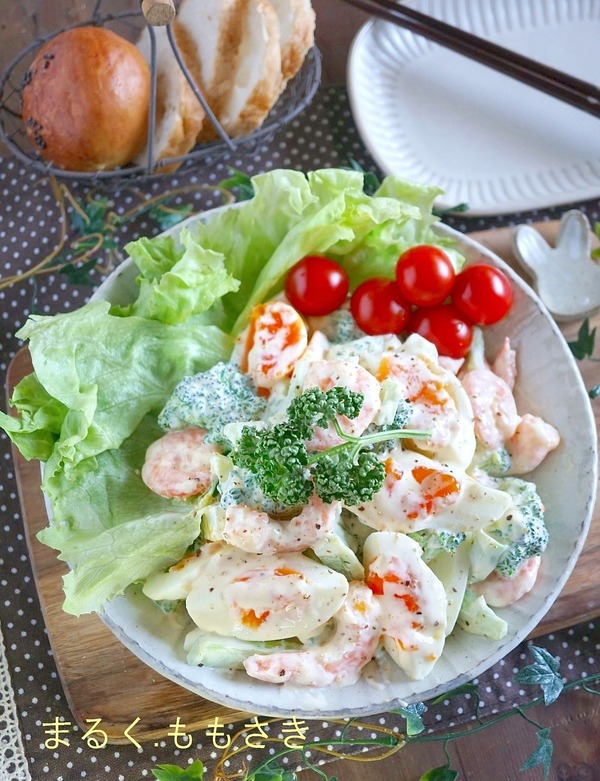 先日帰りが遅くなりスーパーで、剥きエビが半額になっていたので2パック買いましたwそれを使いサラダを作りました。メイン材料がブロッコリー、ゆで卵、エビの3つ。エビが入るので簡単エビマヨ風ドレッシングにしました。それぞれ食感も楽しめます♪ブロッコリーはレンジで ...