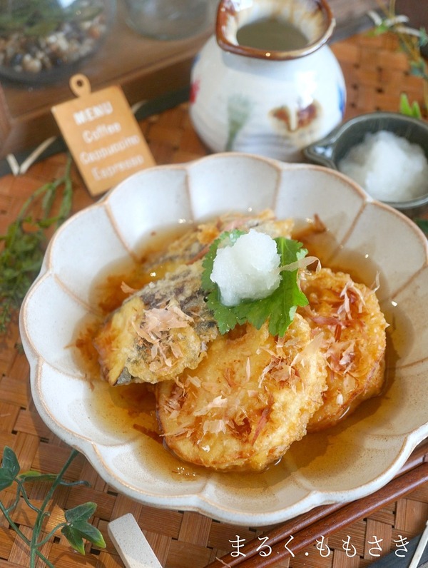 蓮根がお安かったので鶏ミンチを挟んだ蓮根のはさみ揚げを作りました。茄子も揚げ、かつお出汁をかけ大根おろしと三つ葉、かつお節をかけました。蓮根のさっくり、ムギュんとした独特の食感が大好き^^出汁をかけ頂くのがまた合います。 ~~~~~~~~~~~~~~~~~~~~~~材料4人分蓮 ...