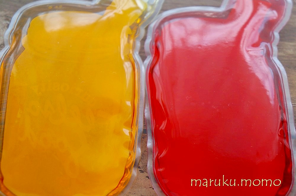 裏面はこのようなよくある保冷剤と同じ柔らかいゼリー状のものが入っています。これは保冷剤として使う場合は6時間以上冷凍庫で冷やしてくださいと書かれています。