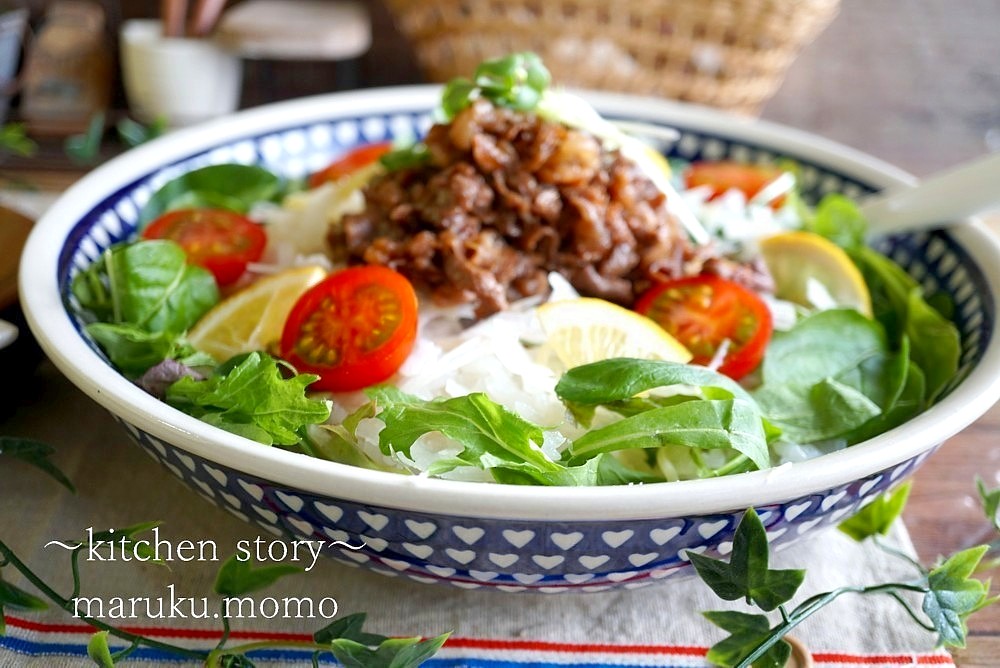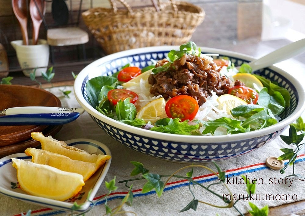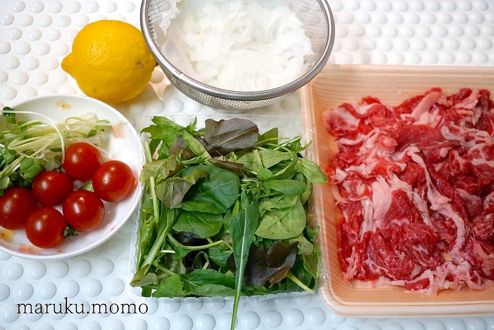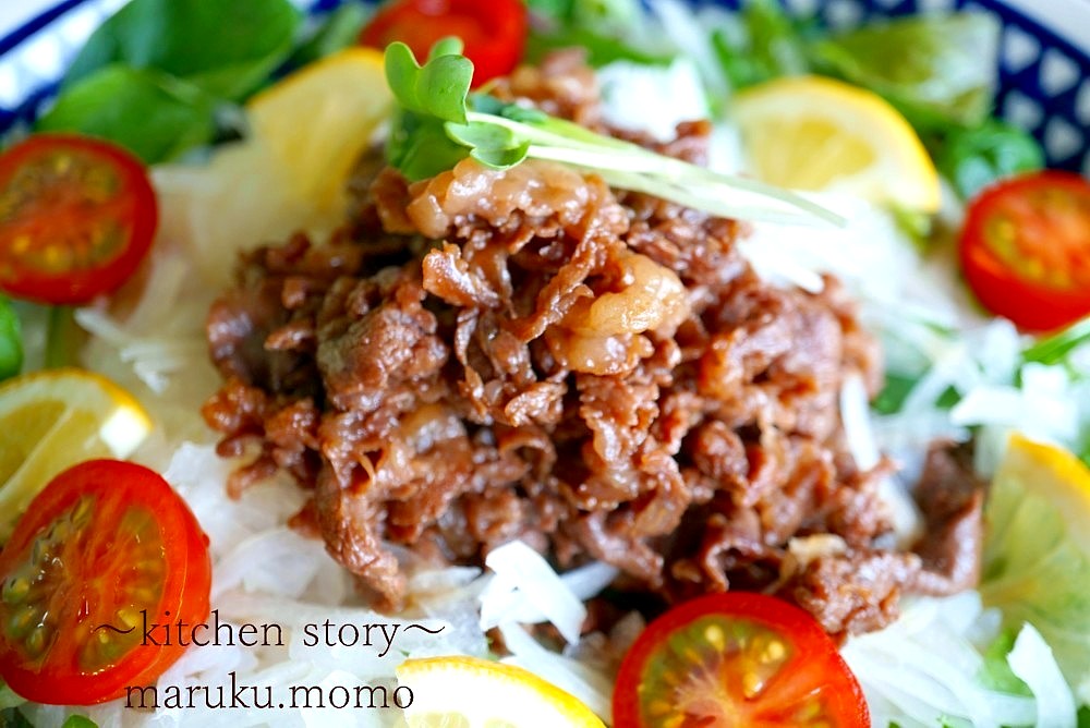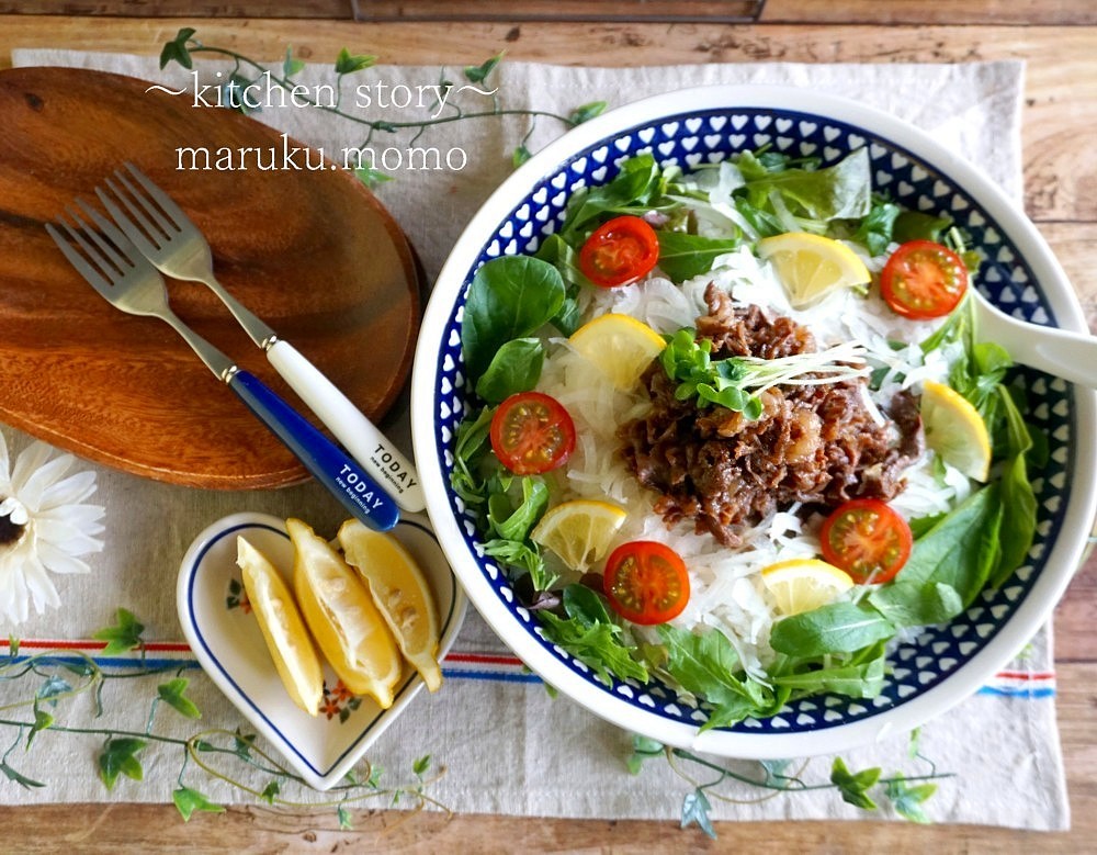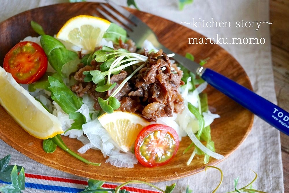 食べる時に、周りの生野菜にレモンを少し搾ります。レモンサラダ寿司に甘辛味の牛肉がとても合いました^^