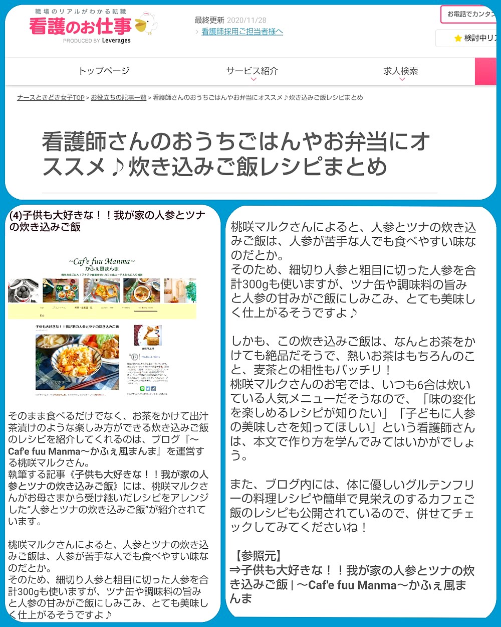 わが家のお気に入りの人参とツナの炊き込みご飯が、看護師さん向けサイトのナースときどき女子の中で『看護師さんのおうちごはんやお弁当にオススメ♪炊き込みご飯レシピまとめ』に掲載して頂きました