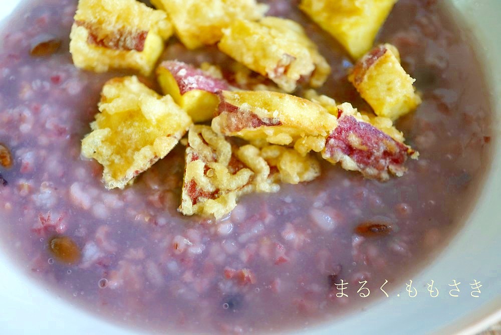 少し混ぜて一緒に食べます。揚げたてはサクサク感もありますが、次の日のさつま芋の天ぷらでもレンジで少し温め入れると柔らかくってお粥さんとなじみます
