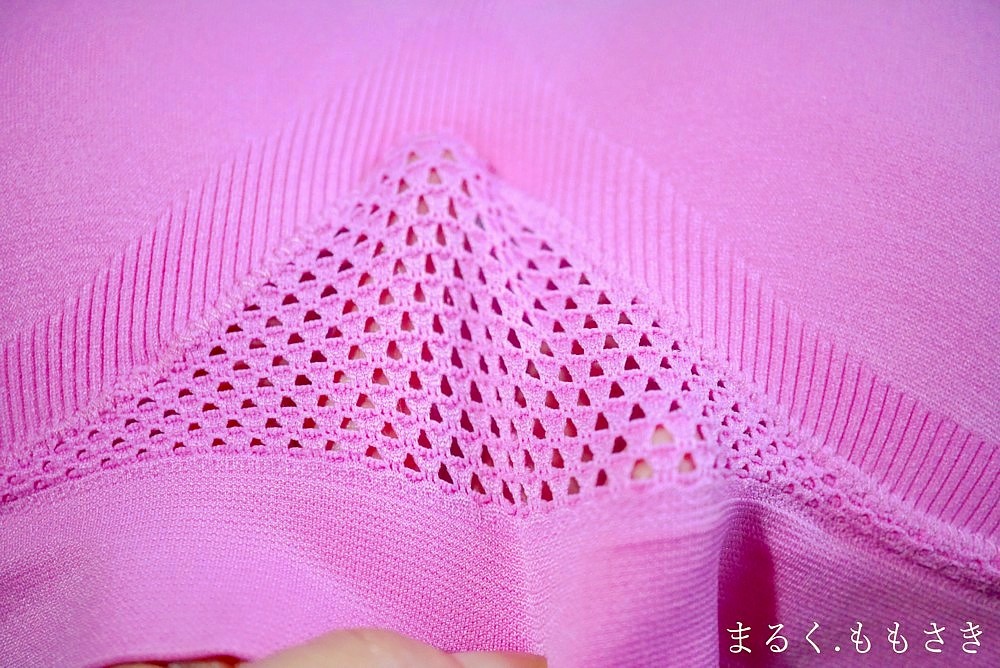 前の下と背中はメッシュになっていてこれ、すごく伸びます!(片手で撮影しているので、手が足りず伸び幅見せられないけど(笑))通気性もあります。
