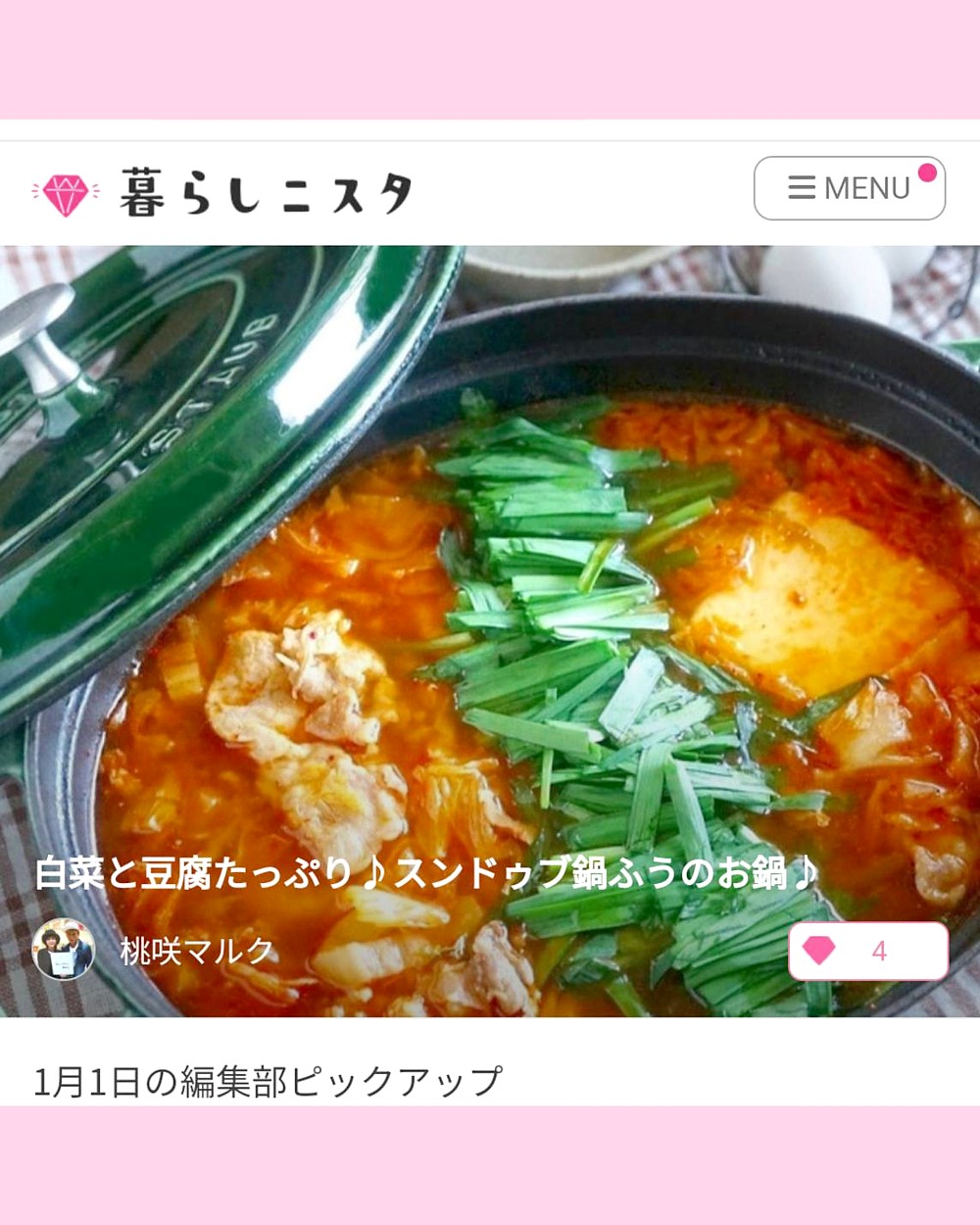 ◆こちらも暮らし二スタさんHPのトップページに編集部ピックアップ記事に『白菜と豆腐たっぷり♪スンドゥブ鍋ふうのお鍋』を掲載して頂いたものです。