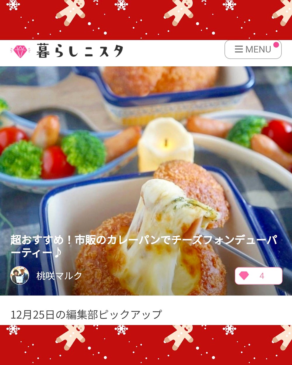 ◆暮らし二スタさんHPのトップページに編集部ピックアップ記事に『超おすすめ!市販のカレーパンでチーズフォンデュパーティー♪』を掲載して頂いたものです。