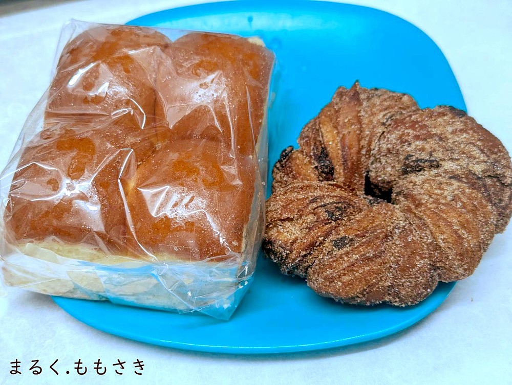 パリパリモチモチドーナツ(レーズン・シナモン)、たっぷり卵のちぎりパン。サクサクドーナツにふんわり生地のパンで美味しかったです(←自分もたべてるw)