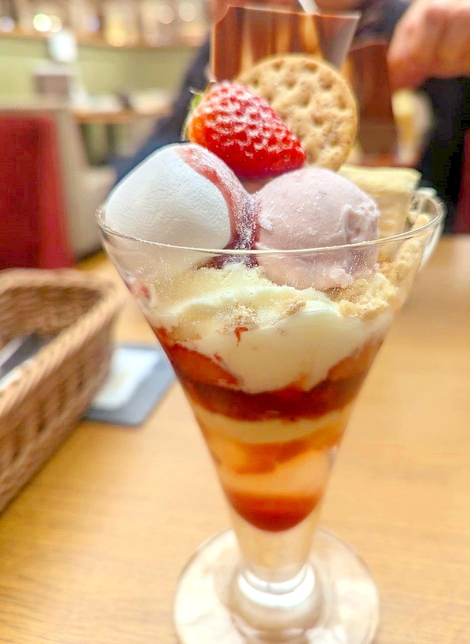 梅田阪急三番街リバーカフェのご褒美いちごのパフェ1180円。安い♪これね見た目はそれほど豪華では無いけど、パフェに入るアイスが今まで食べたパフェの中で1番美味しい!凄く粘りがあり何このアイス?と二人でびっくり。