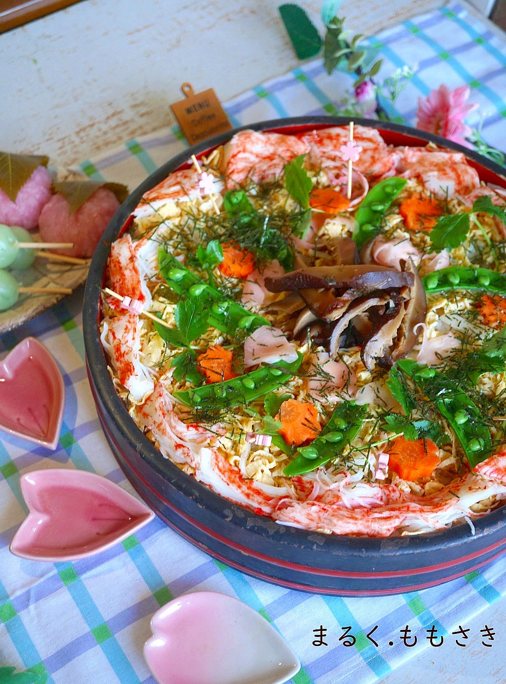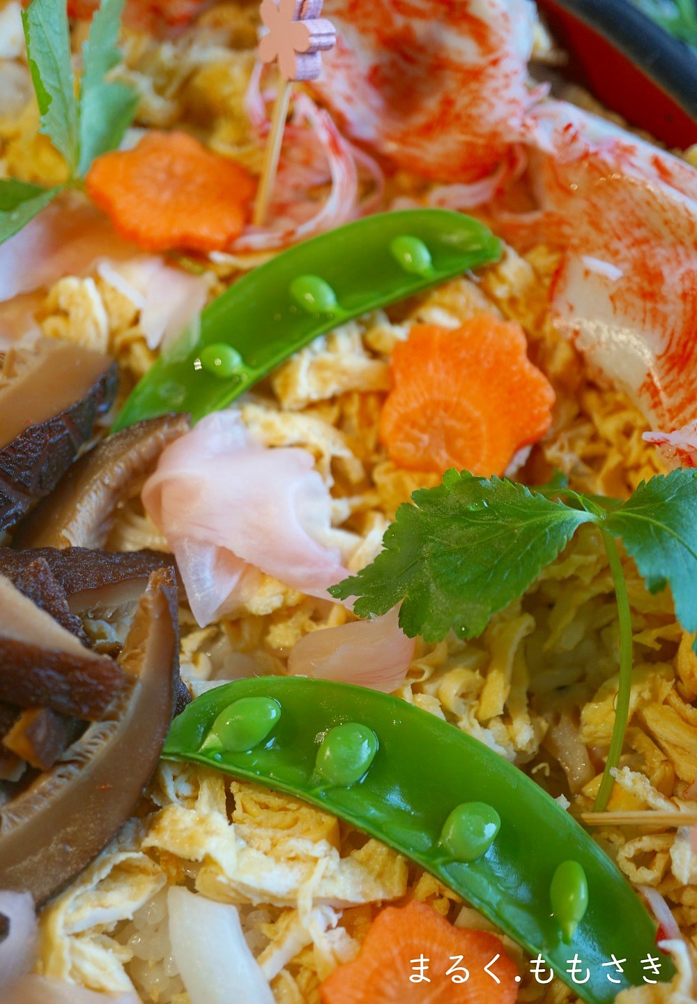 あとはカニカマ・スナップエンドウ・生姜酢漬け・干し椎茸・人参型抜き・三つ葉・海苔を乗せました。レンコンのシャキシャキ食感が最高😍