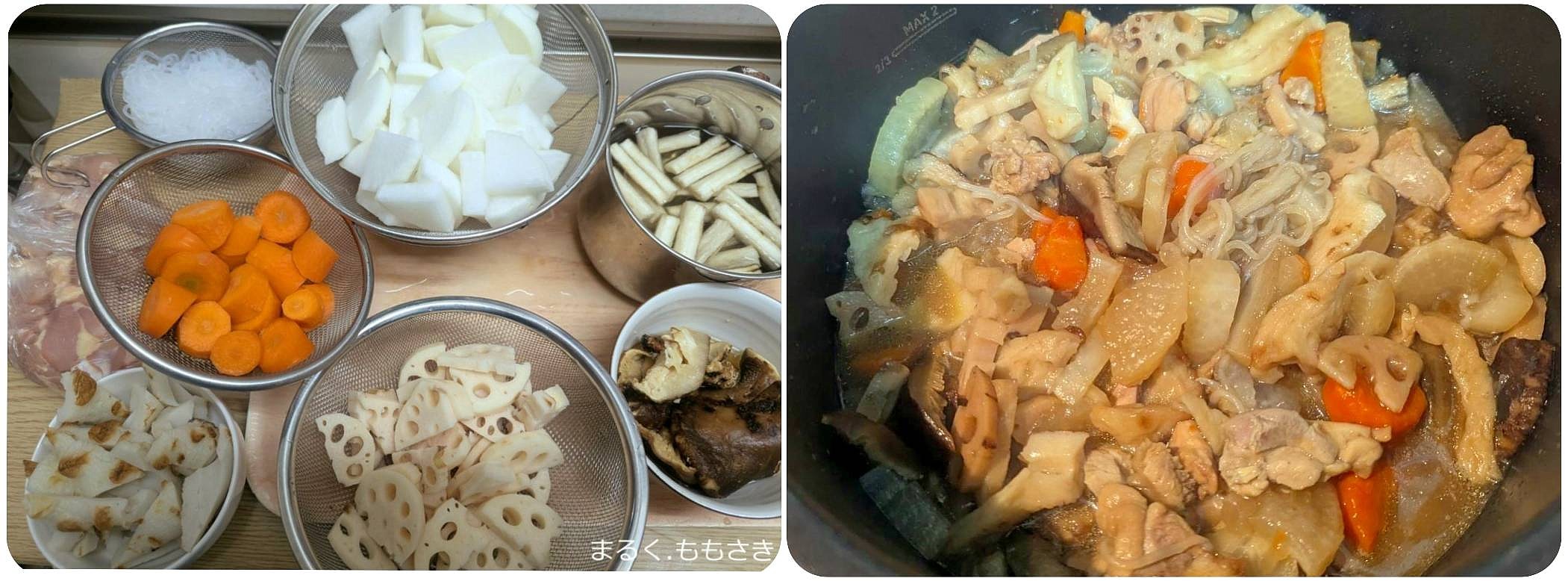 筑前煮は材料がいろいろあるからそれぞれカットですね。花形にはせず本当に口で伝え切ってもらった^^わが家は糸コンニャクを入れます。仕上げにとろみをつけるので糸コンがヘルシー麺のように食べれて取り合いです^^圧力鍋なので6分かけるだけ。