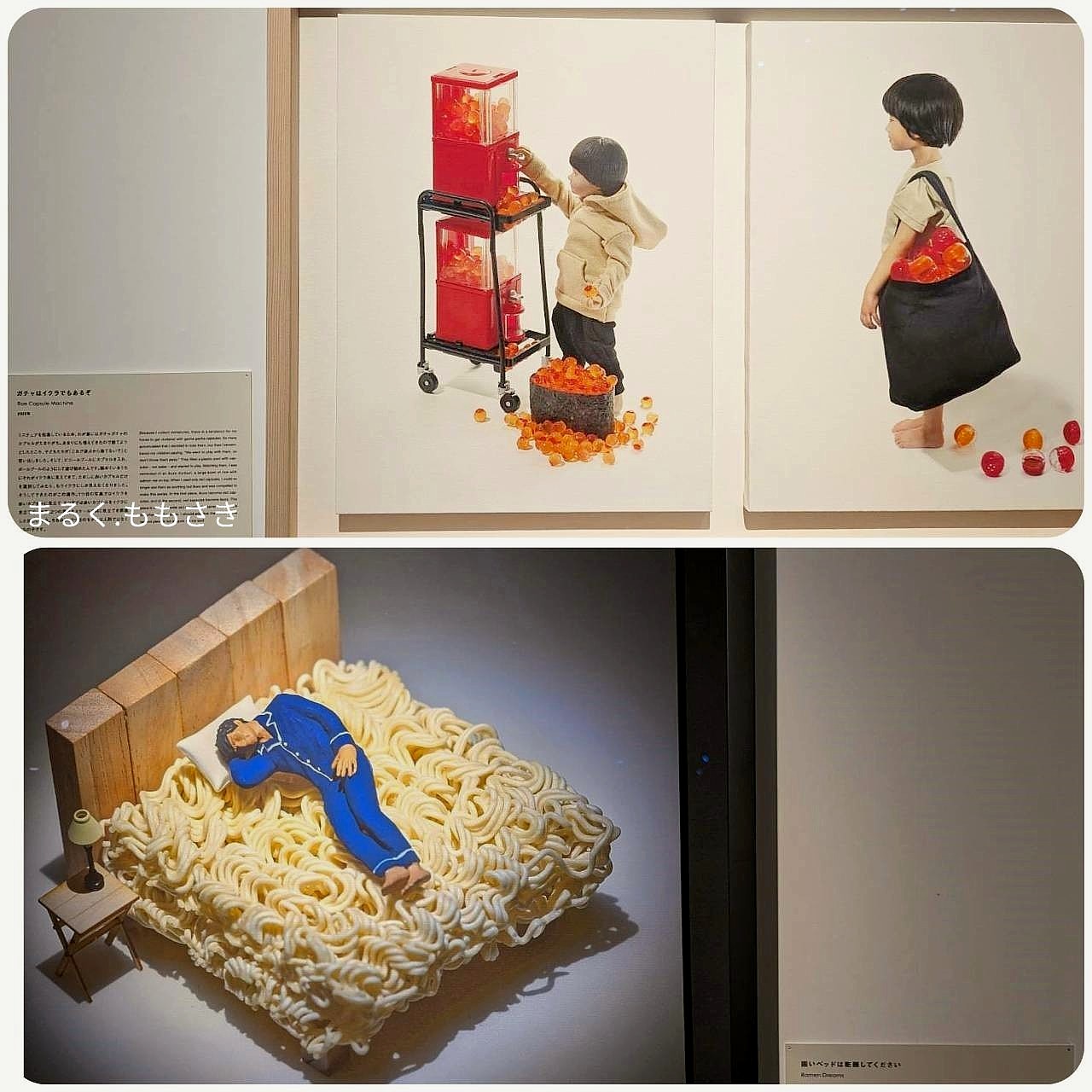 『ガチャのカプセルを見て子供がビニールプールに入れ遊び始め眺めているとイクラ丼にしか見えなくなりこの作品ができた。2枚目は赤いカプセルをイクラに見たてた実際田中さんのお子様』