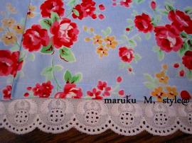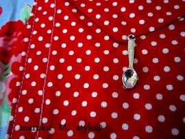ポケットは赤い水玉を使い、エプロンの花柄の上に柄を重ねるという、