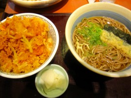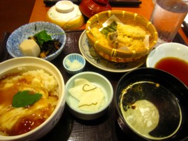 夫はかき揚げ天丼とお蕎麦です。私は京都なので湯葉ご膳です。 湯葉がトロりんとした丼です!