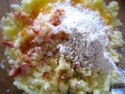 3ボールにじゃが芋を潰して、その中へ②のを入れて、粉類・卵・豆乳もしくは牛乳を入れます。