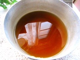 ②濃い目に入れた番茶は60度くらいにしておきます。(熱いとゼラチンが固まらない)そこに砂糖を入れます。