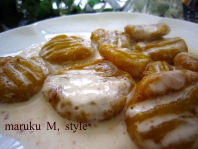 モチモチとる~ん♪の かぼちゃ風味のニョッキなので、餡を添えてみても いいかもですね。