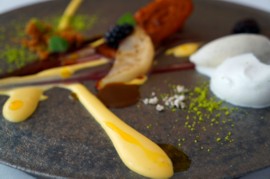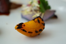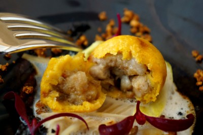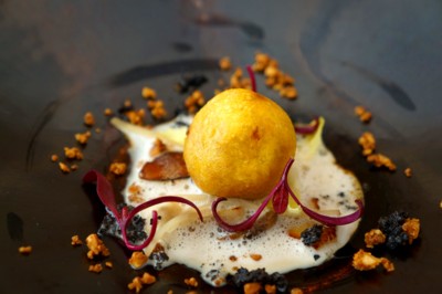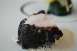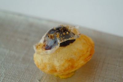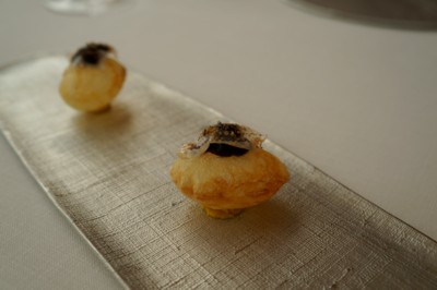 ジャガイモのスフレ 上にナツメヤシのコンフィにラルドを乗せたもの。