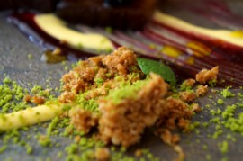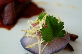 手羽 ナツメヤシのコーティング、内臓 セルフィーユシュべロンピュレビーツのコンフィ、黄人参添え