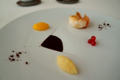 ● 相模湾産の赤座海老、赤座海老の卵と桑の実と赤ワインのソース生姜のピューレ。
