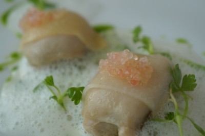 昆布〆した平目の中にカリっとしたケイパーを入れて、黒大根のスライスで巻いてあるもの。