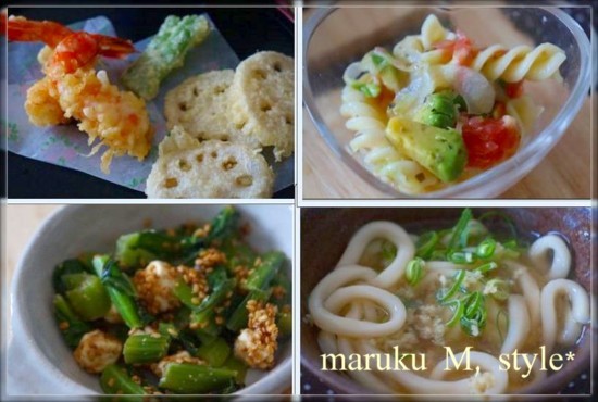 ばら寿司・天ぷら・小松菜とチーズのお浸し・アボカドと新玉ねぎのマカロニサラダ・あんかけ生姜うどん~♪