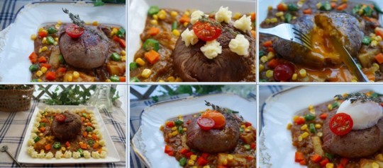 普通にトマト・マッシュポテトを乗せたもの・上ではなくお皿周りに飾るバージョン・はたまた?黄身だけ・・・