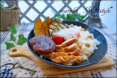 後はひよこ豆を入れて炊いたご飯に、お野菜を乗せて鶏肉を乗せます。