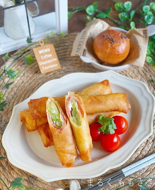 味つけはマヨネーズだけで出来るアスパラガスとベーコンの春巻き。春巻きの皮に具材を乗せ巻いて揚げるだけ♪サクサク衣の中のアスパラガスはジューシーでベーコンとマヨネーズの風味・塩分で食べれるので簡単。これ結婚した時、唯一夫が作ってくれた1品です!唯一です(笑) ...