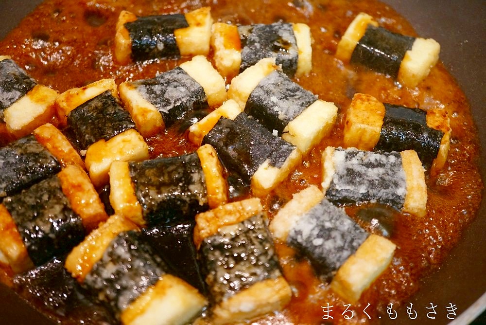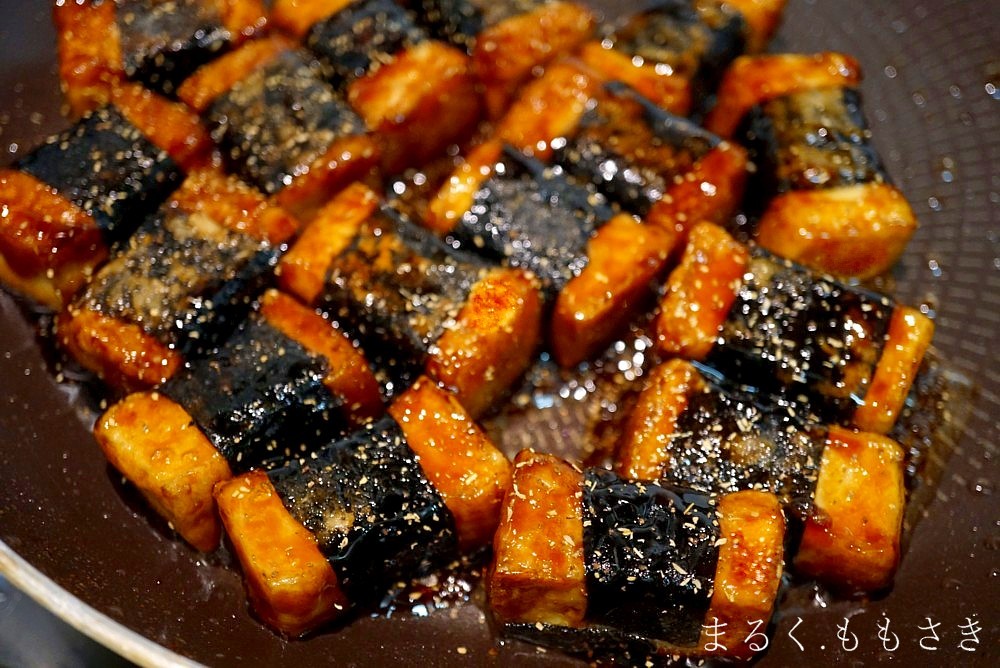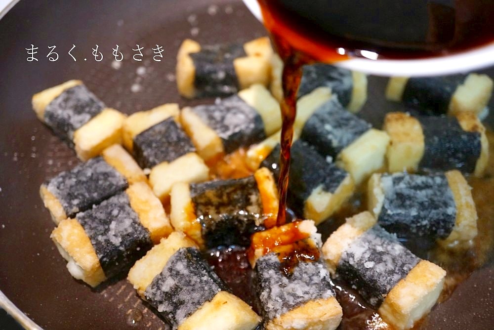 厚揚げに焼き海苔を巻いて片栗粉をまぶしフライパンで焼き、仕上げに甘辛タレをジュ~と絡めた磯辺焼き。仕上げに粉山椒をかけると香りも増します^^今回はやわらか絹揚げを使ったのでもっちりに仕上がります。