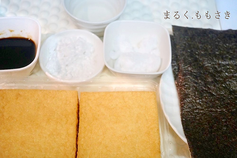 ●焼き海苔4分の1枚を3つに切り(12切)16枚用意しておく。