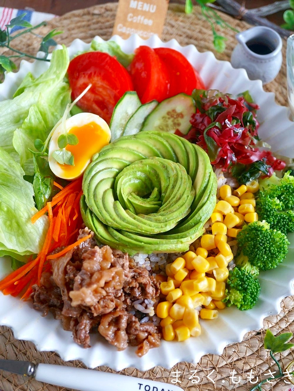 雑穀米にたっぷりの野菜を乗せ、市販のドレッシングで食べるので簡単でカフェぽく仕上がります^^家で普通に野菜を用意してバイキング形式にして食べる事もありますが、簡単でそれも楽しいです。