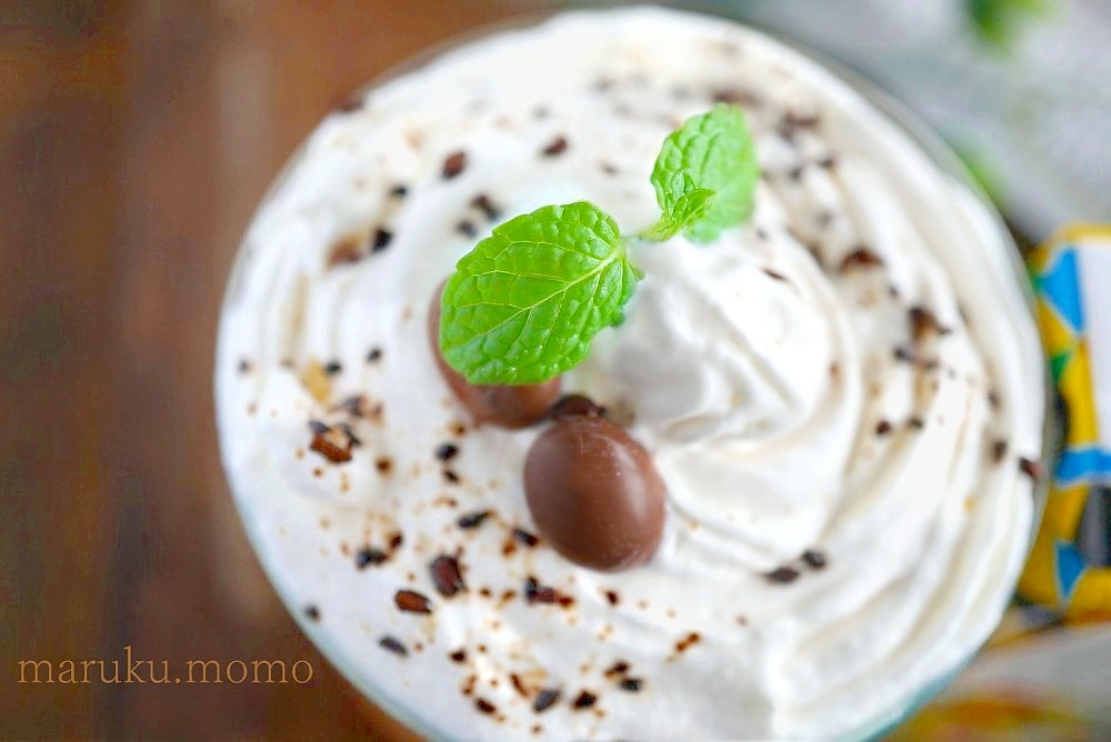 ホイップにはラム酒と砂糖を入れています。ミント、コーヒービートのお菓子を乗せインスタントコーヒーの粗挽きタイプの粉を散らしました。
