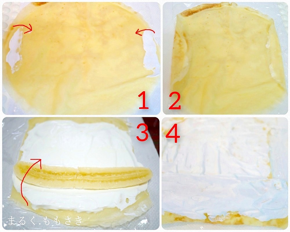 手順が細かくなったので、普通にクレープを焼いてバナナと生クリームを入れ巻いて食べるだけでも美味しいですよ^^どうしてもミルクレープぽい形にしたくって(笑)太めのミルクレープだけどね’(笑)
