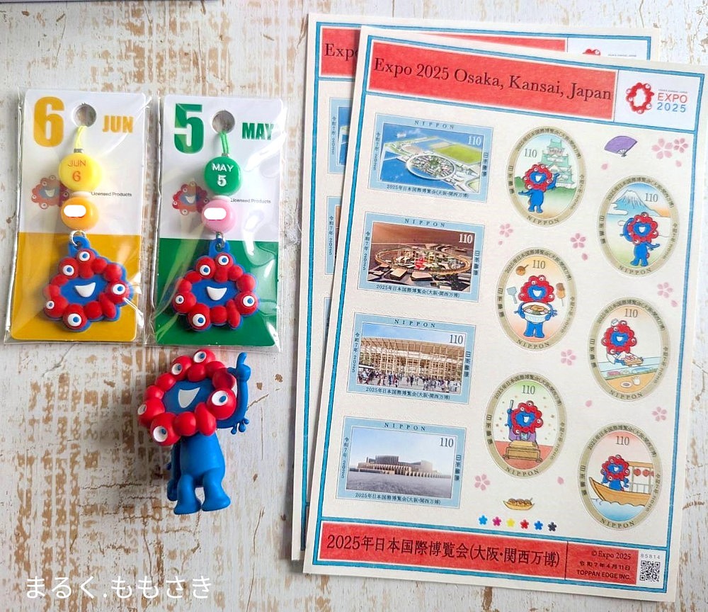 実際万博で買ったのはこれだけ。誕生日365日分あるストラップが面白い。娘は友達の分も買っていた(笑)万博の郵便局で買った切手は入場して1番に買った。ガチャガチャの3種類。