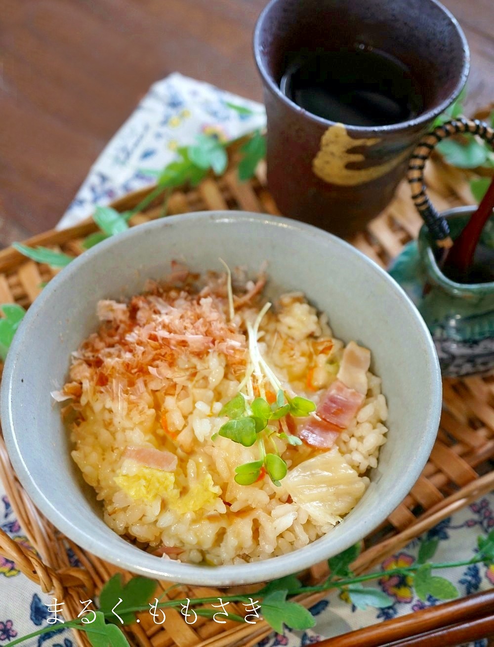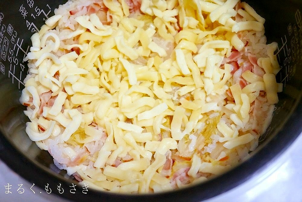 白菜のお漬物、ベーコンを使った炊き込みご飯です。炊けたら溶けるチーズを入れ、器によそいかつお節を乗せた和風テイスとのカルボナーラご飯です♪