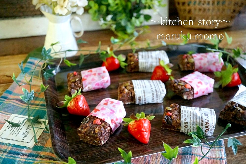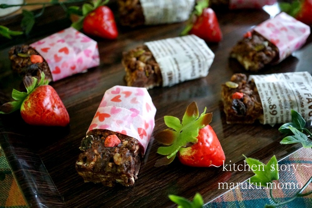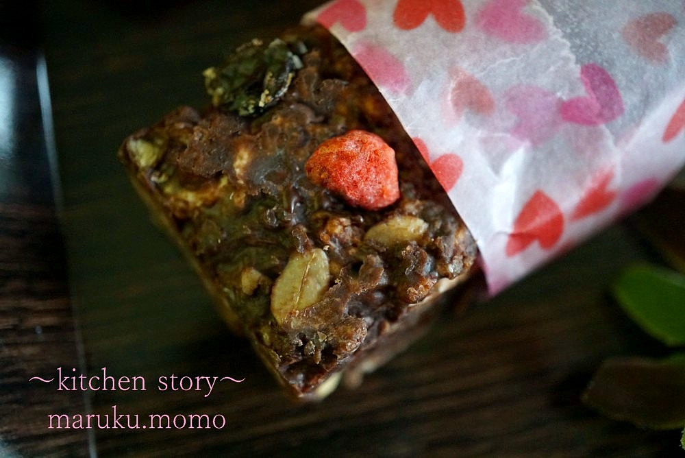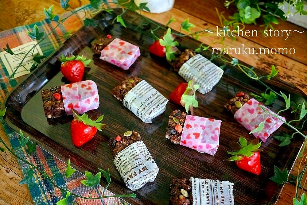 かぼちゃの種やレーズン、乾燥イチゴ入りです。バレンタイン用なのでハートのワックスペーパー