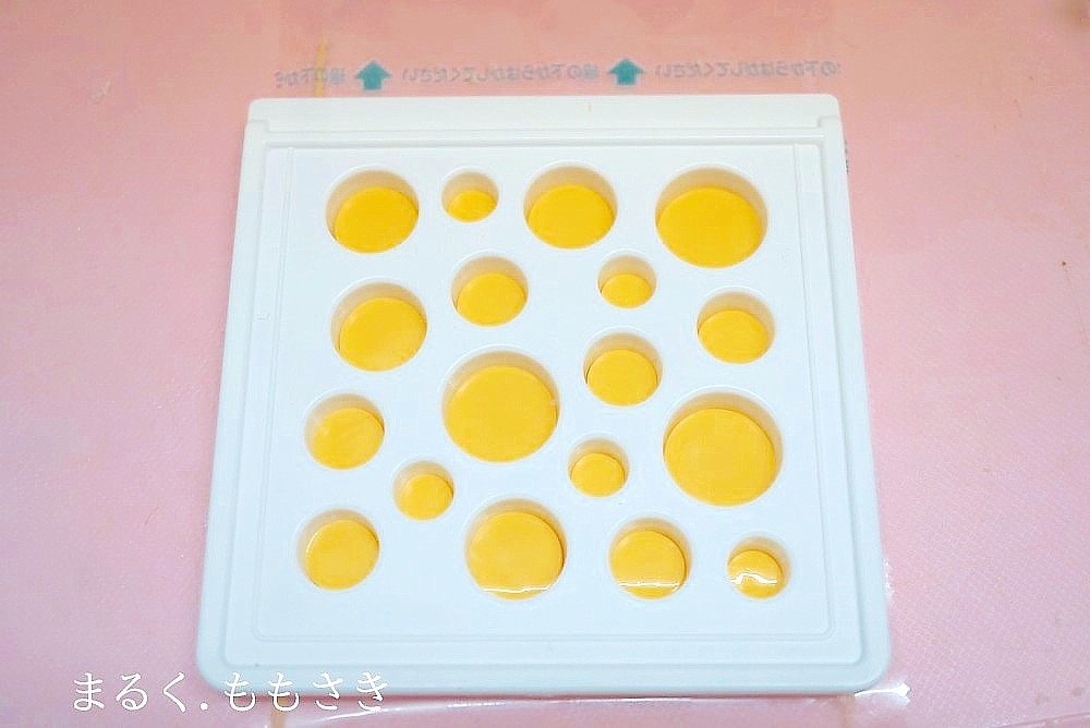 チーズの上で軽く押しても抜けないので全体に均等に押し、そのあとに裏面から抜けていない型の場所を手やナイフで押さえる事が綺麗に抜くコツです。裏返すと抜けていない(力が入っていない)場所があるのがわかる。