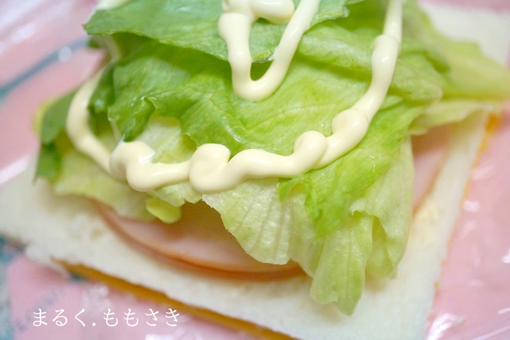 両面にバターを塗り、ハムとレタスキュウリ、マヨネーズを搾り蓋をする。