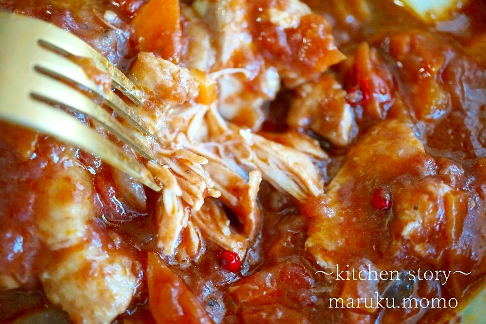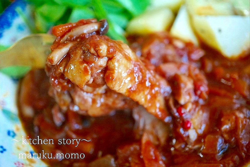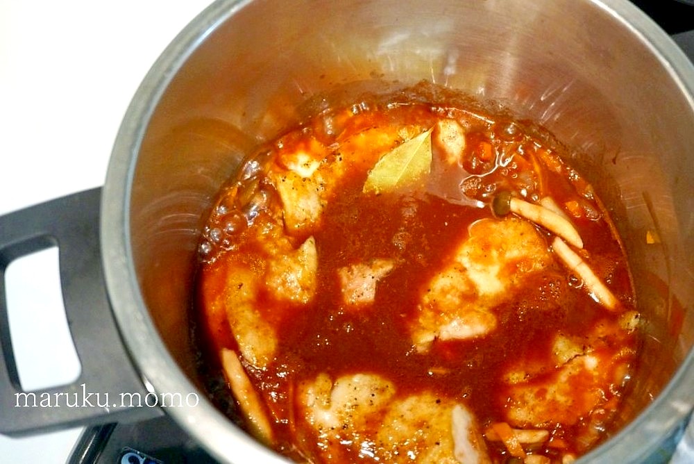 チキンの赤ワイン煮込みを作りました。圧力鍋で10分。もうお箸で刺しても柔らかすぎてわからないほど柔らかいです