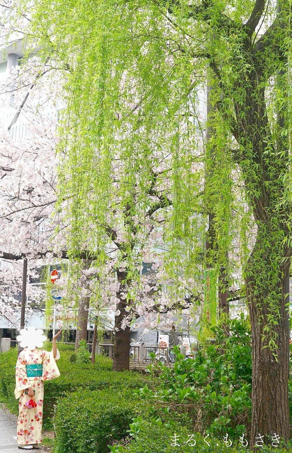 この場所、桜と柳があって綺麗でした^^着物姿の方がいらして京都らしいなと