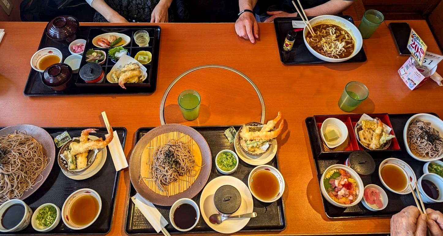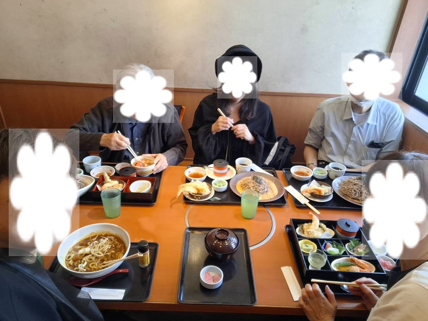 右下から父はなごみ弁当ミニ海鮮丼(税込み1648円)●私は大海老天ざるそば(税込み1208円)+茶碗蒸し(税込み174円)●夫は大海老天ざるそば麺3倍(税込み1208円)●弟はカレーうどん(税込み1098円)+白ご飯(税込み251円)●弟のお嫁さんは四季めぐり善(税込み1978円)さとはお安くていろいろ楽しめるのでいい♪