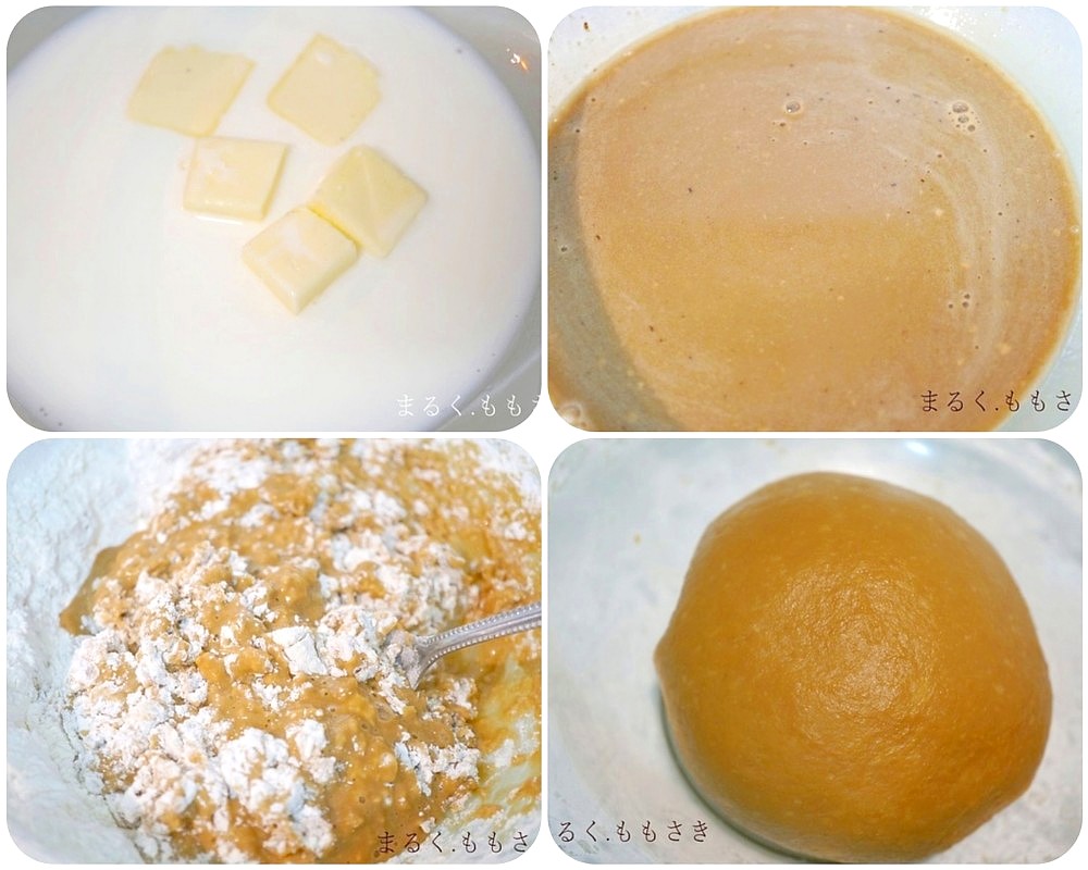 ボウルを取り出しバターが溶けたら混ぜ、イーストを入れ混ぜ、インスタントコーヒーと砂糖を入れ混ぜる。