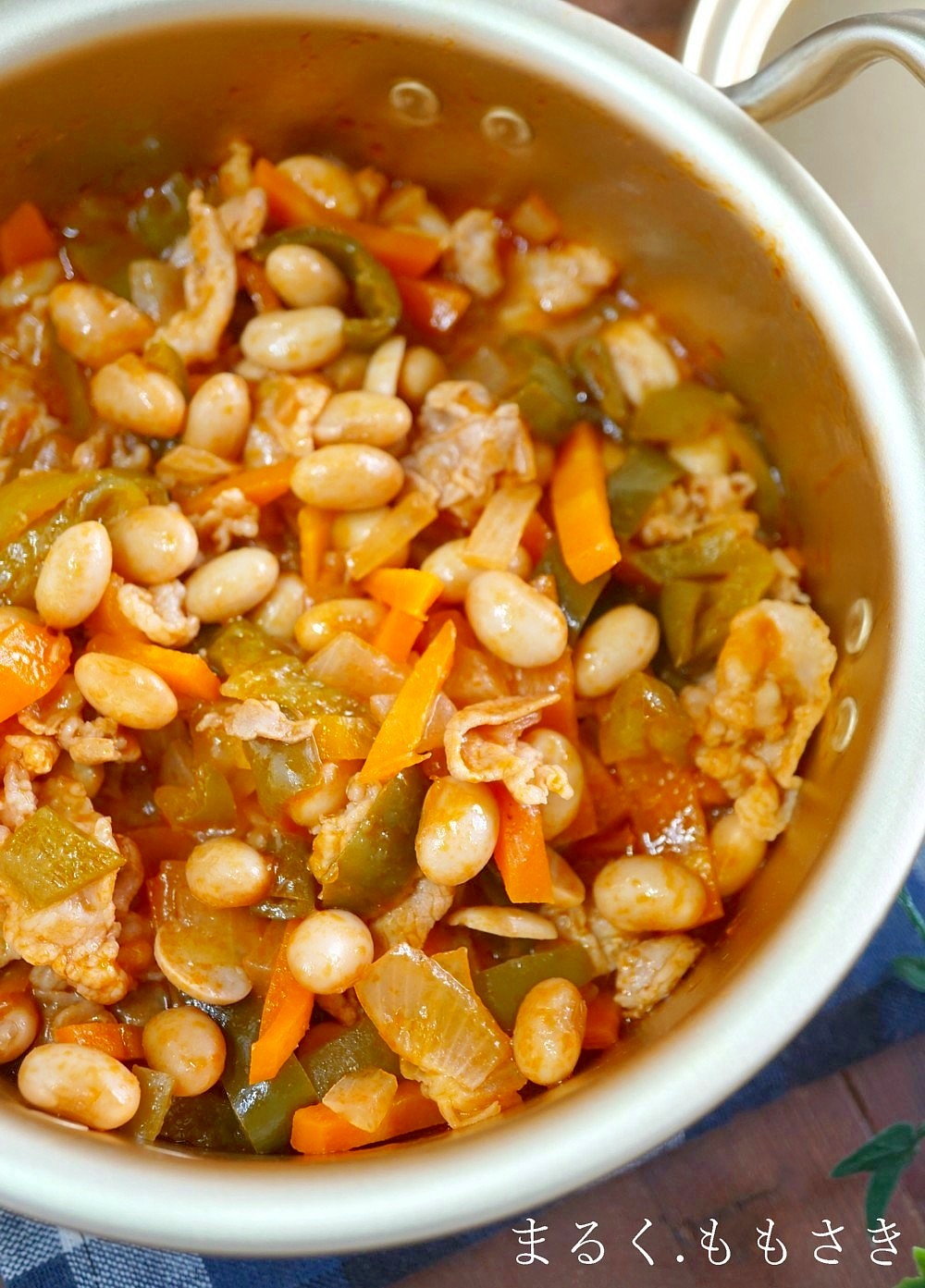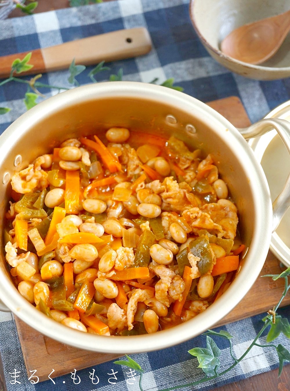 子供時代給食でも出てきた、大豆と豚肉と野菜の煮込み。見た目は地味なのですが食べると癖になる味^^一見子供が苦手な食材が詰まってるように思いますが、好きになる人続出です^^大豆と人参、ピーマン、玉ねぎ、豚肉をケチャップ味で煮込んでいます。大豆と野菜の旨味が詰まっています!今回は作りやすい分量で作っています。