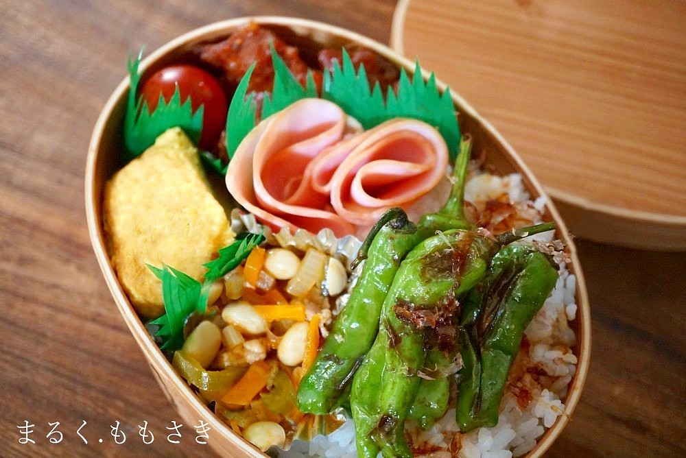 こちらは前回のクジラ肉風の豚肉もポークチャップ入りです。トマトのマリネ、火を通したハムマヨ、チーズ入り卵焼き、万願寺の醤油おかかソテー。