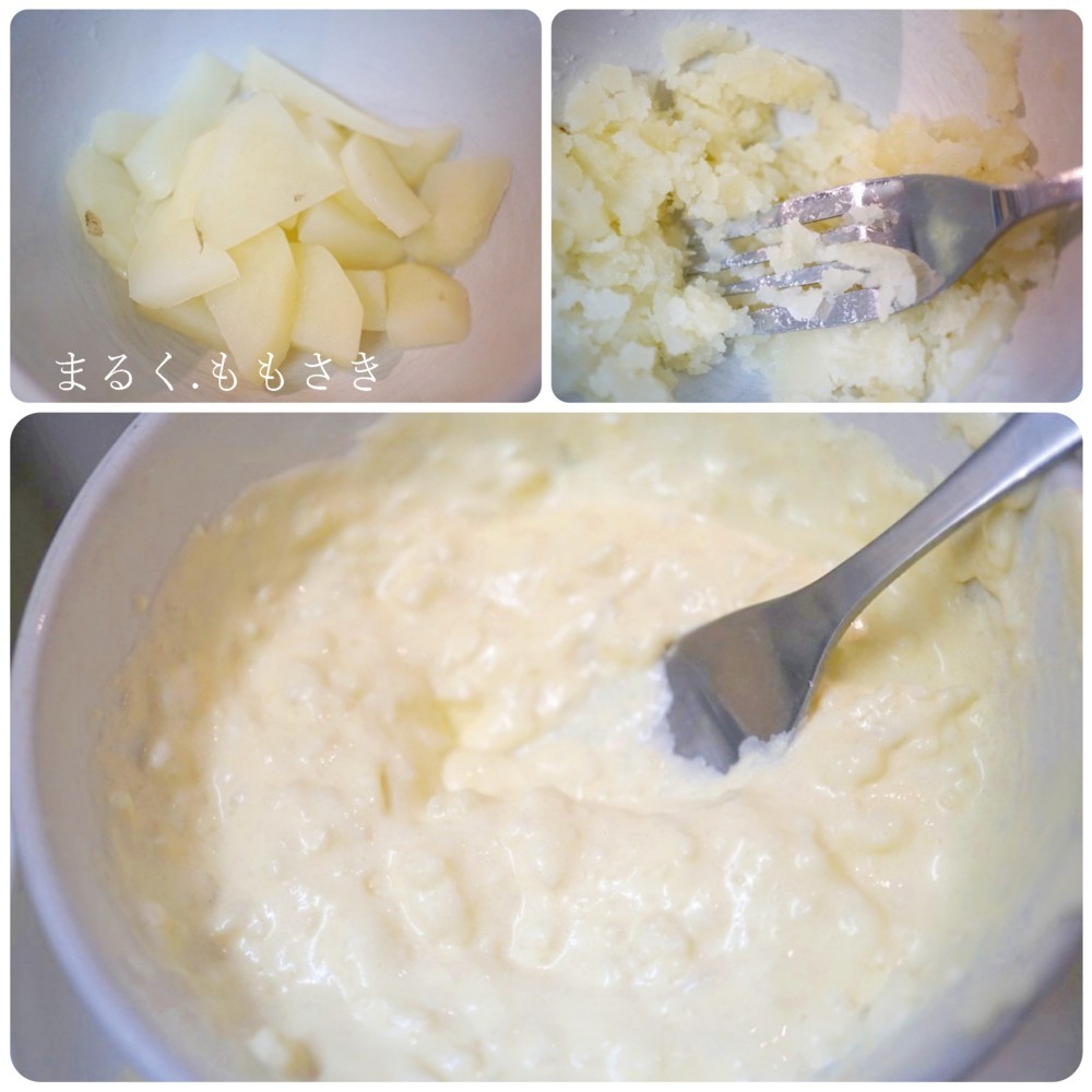 マカロニ40gに卵を3個使います。そしてマヨネーズにレンジでチンしたじゃが芋を潰したのを混ぜるとマヨネーズがホックリ絡みます!