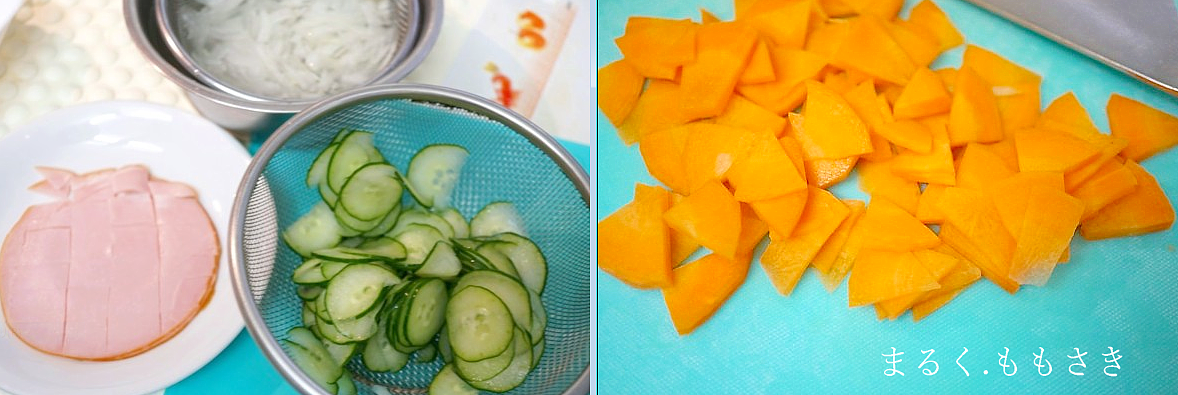 ●きゅうりを薄切りにし塩二つまみをかけ3分置きしっかり水気を切る。