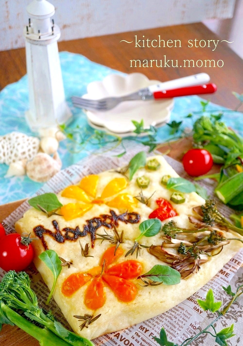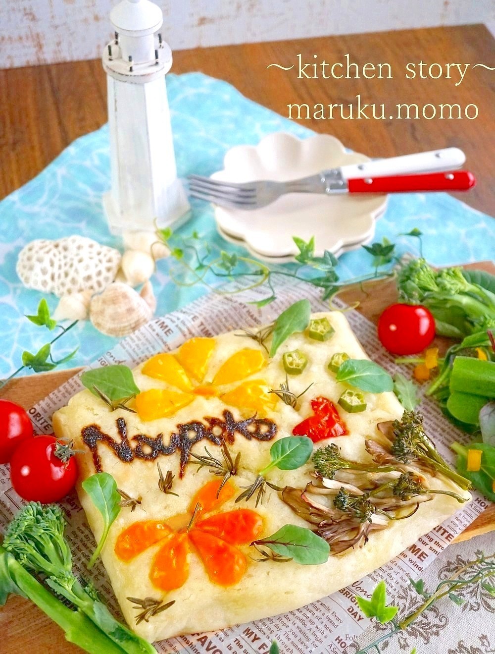 黄パプリカはビーチナウパカにして、オクラで海の貝殻などをイメージしローズマリーを刺しました。そして『Naupaka』の文字を入れたくて岩のりを細い口金と袋で搾りました。細かい部分は爪楊枝で調整。